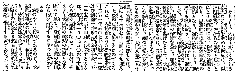 「大阪市が斯くの如き膨大なる計画を進めた因縁は、欧州戦乱後、経済界の擾乱と変動とにより経済的には、物価の暴騰となり、思想的には所謂危険思想の蜂起となり、国内騒然として、動揺する秋に当り、大阪市は、蹶起して、生活問題の緩和及安定を図り、労働者の保護を企て、細民及貧民の救済を遂げむとして、大阪市救済後援会を助け、救済資本金を募集したのに初まるのである。この挙に賛し、競って資金を投ずるもの踵をつぎ、大正八年三月十五日寄付金募集締切に際しては、実に九十三万七千六百六十九円八十七銭の巨額を贏ちえたのであるこれに、内務省よりの委託寄付金十二万一千三百七十六円二十一銭及び別途一時取扱金利子金一万一千五百六十四円を合算するときは、総計金一百〇七万〇六百十円〇八銭の巨額となる。これが、そもそも大阪市の経営の基礎となり因りて以て、我国社会事業の本山たる格を占得するに至った次第である。右のような起因であるので、大阪社会事業の特徴は、救貧的であり、労働者救済本位であり、更に、大阪市の特徴より来る産業的な社会事業に集中する訳である」