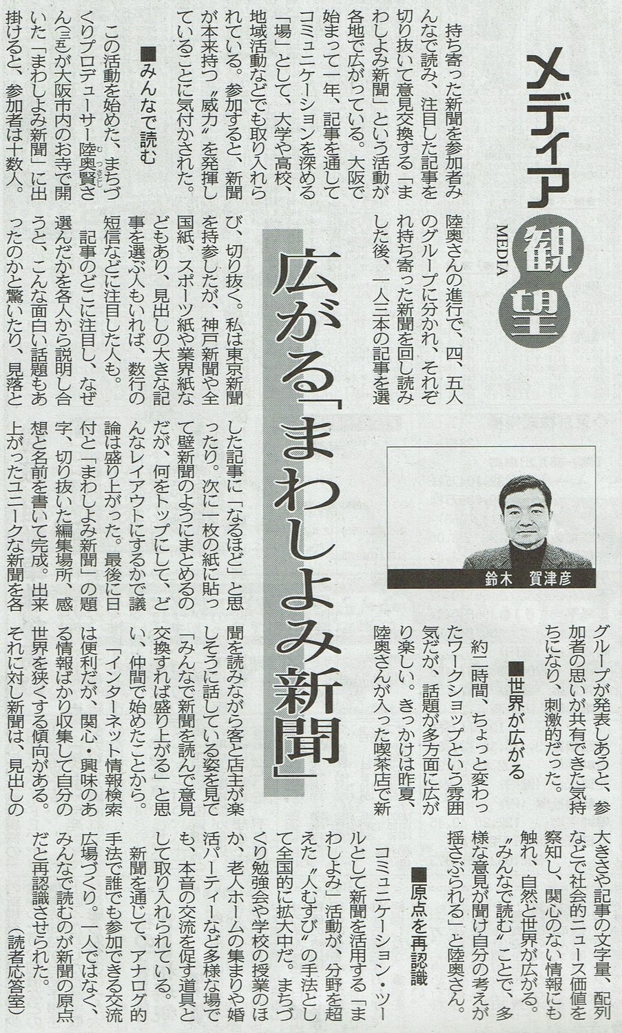 先だって東京新聞(10/29朝刊)のコラム「メディア観望」にて「まわしよみ新聞」が取り上げられたんですが、該当する新聞を鈴木記者から送っていただいたので改めての記事紹介。短く、簡潔に、まわしよみ新聞の体験談と魅力、可能性などがまとめられています^^ 鈴木記者、本当にありがとうございます~!m(_ _)m
