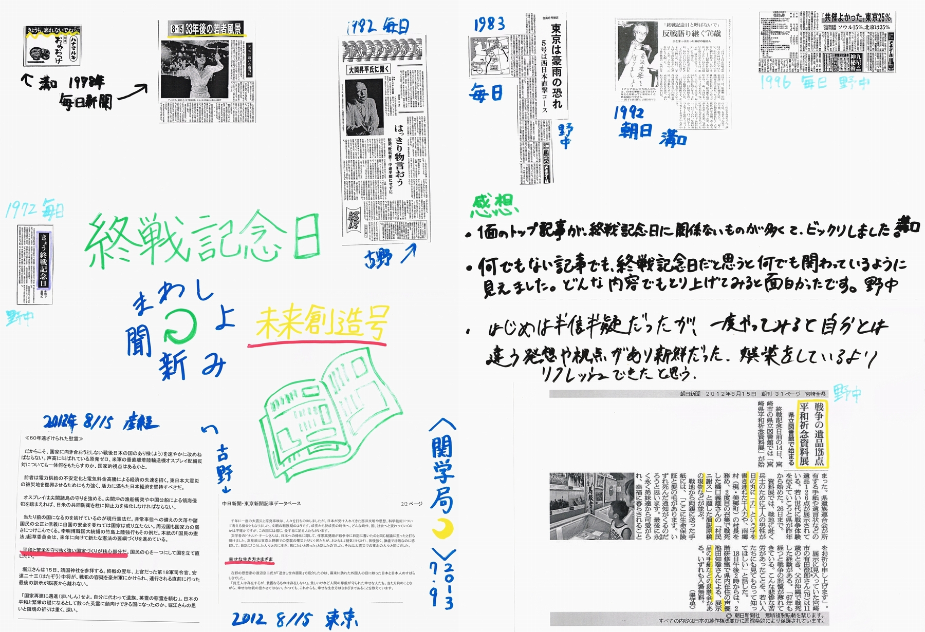 そこで関西学院大学社会学部の鈴木謙介准教授と白波瀬達也助教と一緒に、大学の新聞アーカイブを利用して実施したのが上記の「終戦記念日まわしよみ新聞」。1945年から2011年までの「終戦記念日」に発行された新聞をプリントアウトして「まわしよみ新聞」を作ろうという企画でした。