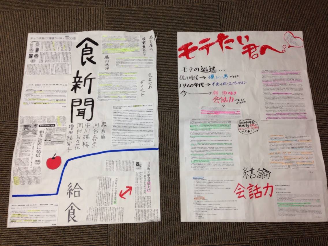 今回、計8グループによるまわしよみ新聞の紙面が完成しましたが、『食新聞』と『モテたい君へ新聞』がとりわけ興味深い内容でした。前者には食材のフェアトレード、食の文化財指定をめぐる功罪、新しいダイエット方法、給食の公的に責任などが紙面に盛り込まれており、まさに食と社会の繋がりを考えさせられる内容でした。また後者は一見チャラい感じですが、実はジェンダースタディと密接に関わるトピックであり、社会学の導入には恰好のテーマです。記事のなかでは「何かに熱心に取り組む男性がモテ要素を備える」とされていましたが、学生さんたちは「では、アニオタたちに対する社会的眼差しはどうなのか」といった内容のディスカッションをしておりました。卑近なことですが重要な着眼です。文章を批判的に読む取り組みは、まずは分量の少ない新聞記事からはじめてみるのがよいのではないかと考えています。