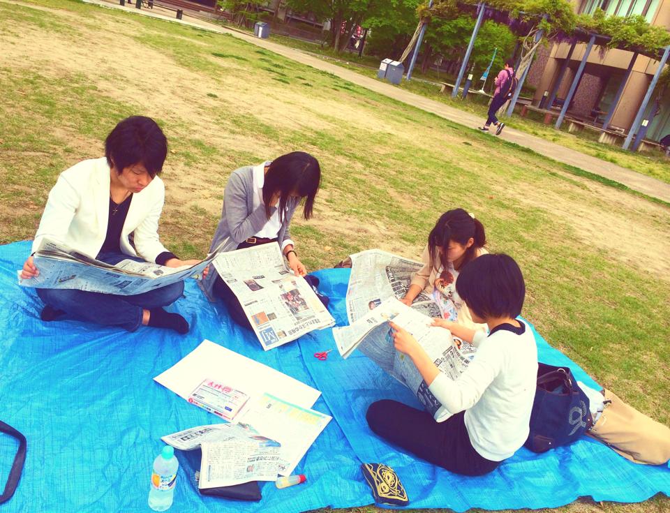 立命館大学の大坪くん、吉村さんが「青空まわしよみ新聞」をやってくれました!当初は立命館大学の館内で「まわしよみ新聞」をやる予定が、天気がええんでキャンパスの芝生の広場でやったみたいですな。学生さんらが主体的にやってはるんで、おそらく「社会勉強」いうよりも「新聞大喜利」的なノリやないかな?と思ってますが、ぼくは「メディア(新聞)で遊ぶ」ってことがやりたかったので、それはそれでよし!むしろ、これこそが理想形ですw 立命館大学では次回は5/9(金)にやるそうです!ご興味ある方は、ぜひともご参加を~!^^