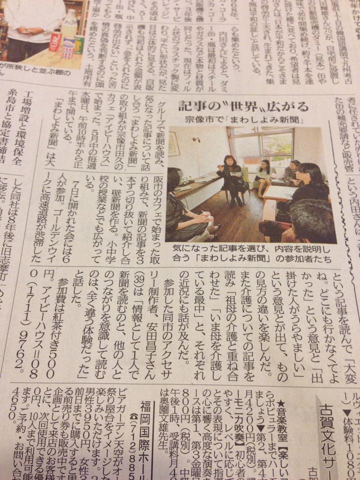 安武さんの記事よりシェアです。先だっては毎日新聞の三重版に記事が出ましたが、宗像市のカフェ「アイビーハウス」さんで実施された「まわしよみ新聞」も取材されて、その記事が出たようです!^^