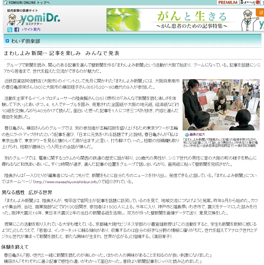 先だっての読売新聞さんの「まわしよみ新聞」の取材記事がサイトに掲載されました。感謝です!m(_ _)m