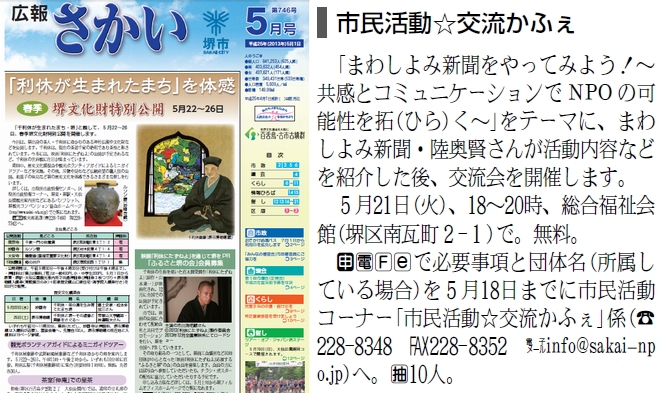 『広報さかい』に5/21(火)18時より「市民活動☆交流かふぇ」で開催する「まわしよみ新聞ワークショップ」の記事が掲載されました!堺界隈の方、よろしければご参加を~!^^