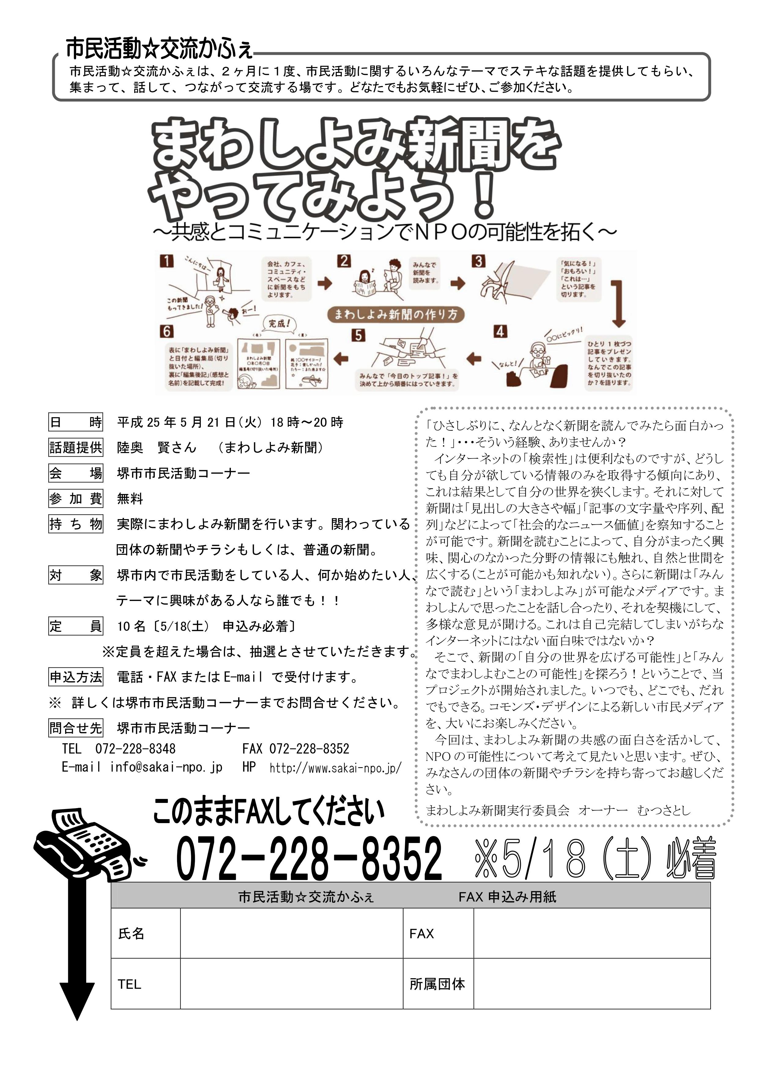 5/21(火)18時より堺市市民活動コーナー「交流☆かふぇ」にて「まわしよみ新聞をやってみよう! ~共感とコミュニケーションでNPOの可能性を拓く」を開催しますが、そのチラシが出来上がりました!当日飛び入り参加もOKです!堺市民の方や市民活動にご興味ある方はぜひともご参加してください~!^^